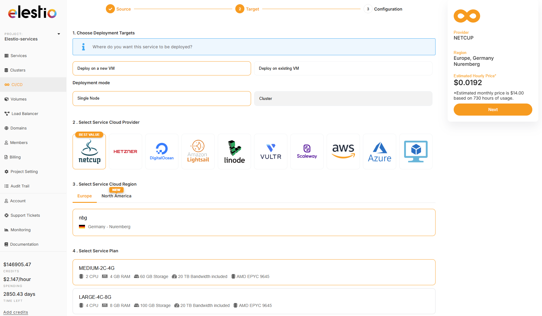 2) on the next step select Deploy on a new VM and select your target cloud provider/region (we recommend netcup & hetzner) then click on the Next button on the right side