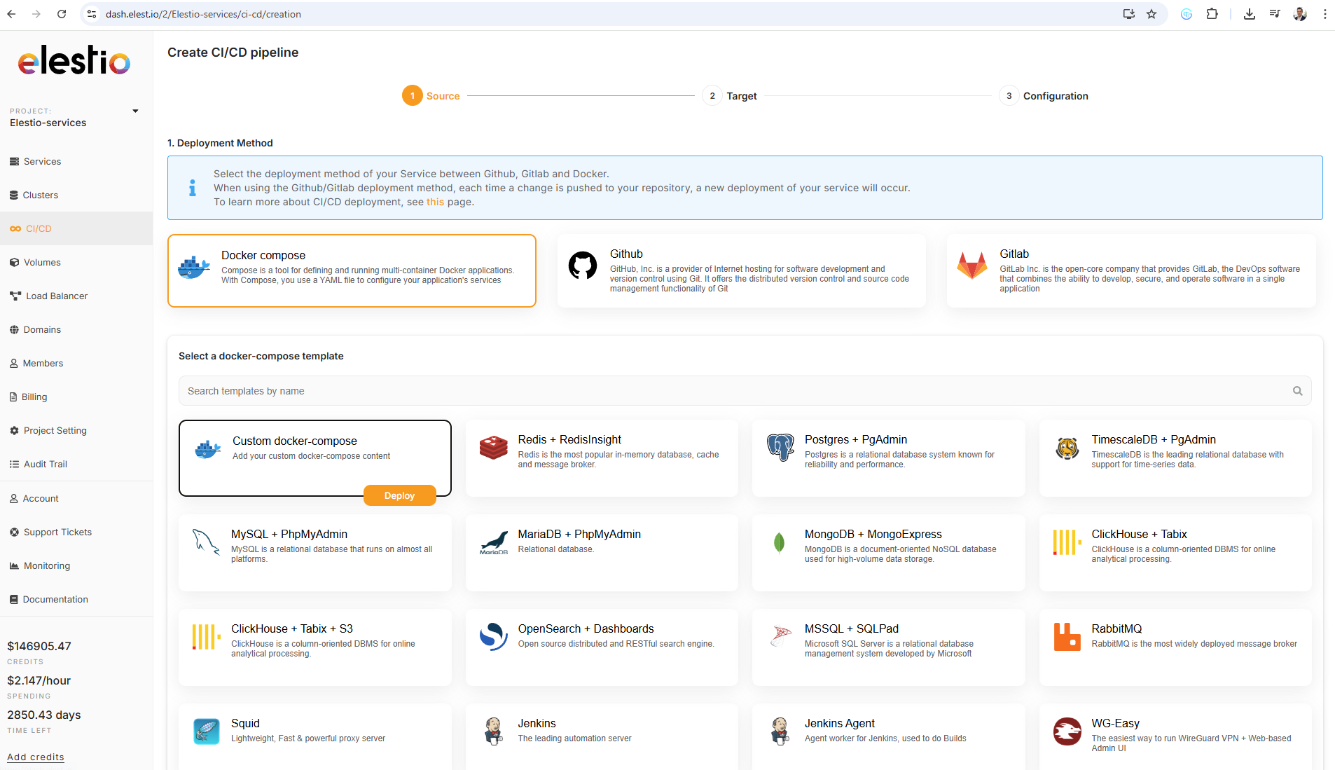 1) Open elestio dashboard and click on CI/CD on the left menu, there click on Docker Compose > Custom docker compose